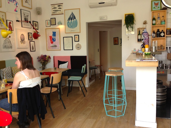 Dintorni a parte, il Café Cometa penso sia uno dei posti più carini che ci sia mai capitato di vedere: cuscini d’artista, sgabelli di design (ah quegli sgabelli!), quadri, una bicicletta retrò appesa alla parete, e una toilette che riesce a non sfigurare di fronte al resto del locale. Noi ci abbiamo consumato una specie di brunch insano a base di hummus con pita e nachos con guacamole (circa 5 euro ognuno), tutto ottimo e dall’aspetto casalingo. In comune con il Cosmo ha il menu, identico, e l’assenza inspiegabile del wi-fi.