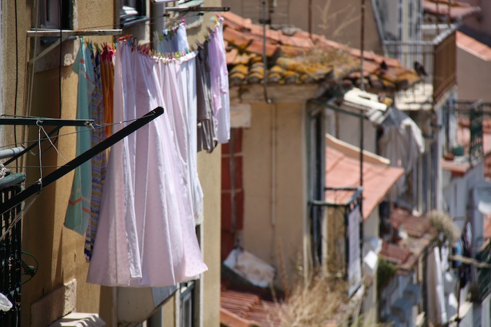 L’accesso migliore al quartiere si ha dal Miradouro das portas do Sol, una terrazza assolata ben servita dai tram che offre tra l’altro una delle viste di Lisbona più incantevoli che si possa ottenere: in alto a sinistra la grande mole del monastero di São Vicente de Fora, ai propri piedi l’Alfama, con i suoi mille tetti incastrati gli uni sugli altri, e all’orizzonte l’azzurro del Tejo, che immenso com’è sembra già mare. Dal Miradouro basta poi varcare un piccolo sottopasso in prossimità del café per cominciare ad addentrarsi tra le stradine tortuose disseminate di scale che portano inevitabilmente verso il basso. Tra i vicoli si incontrano suggestive piazzette, alberi di fico, viti, e mille porticine spalancate da cui esce odore di bucato e pavimenti appena puliti. Ci sono anche molti ristoranti e tanti localini dove di sera si ascolta il fado, ma la cosa più bella per noi è proprio passeggiare a caso per le strade annusando l’aria, ascoltando le voci delle casalinghe, sbirciando i bambini tornare imbronciati da scuola.